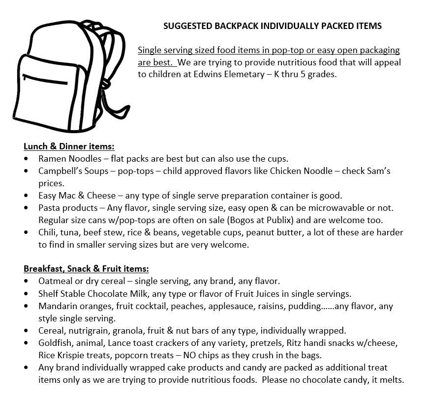 Backpack Food Sunday is the 3rd Sunday of each month and provides weekend meals for needy children at Edwins Elementary School during the school year. The program is managed by the Feeling the Gulf Coast Food Bank in Milton as part of the Feeding America national program. Bring individually-packed nutritious food items to the lobby of the Christian Life Center. A specific shopping list is available in the Christian Life Center, and monetary donations are also welcome so food items can be purchased.